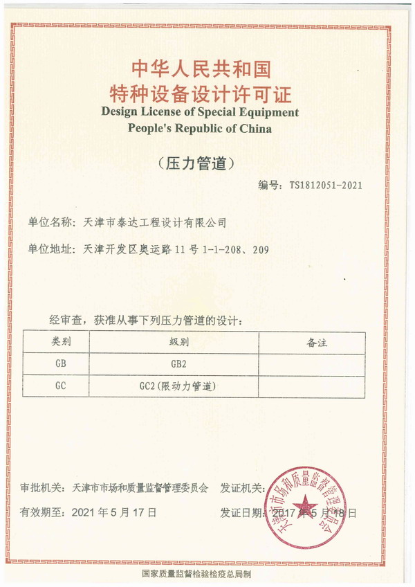 - 泰達設(shè)計喜獲“壓力管道”特種設(shè)備設(shè)計資質(zhì)5月18日,天津市泰達工程設(shè)計有限公司通過天津市市場和質(zhì)量監(jiān)督管理委員會審批,取得“中華人民共和國特種設(shè)備設(shè)計許可證(壓力管道)”,獲準從事GB2、GC2級壓力管道設(shè)計工作。該項資質(zhì)的獲得,進一步增強了泰達設(shè)計在熱力工程設(shè)計方面的市場競爭力。