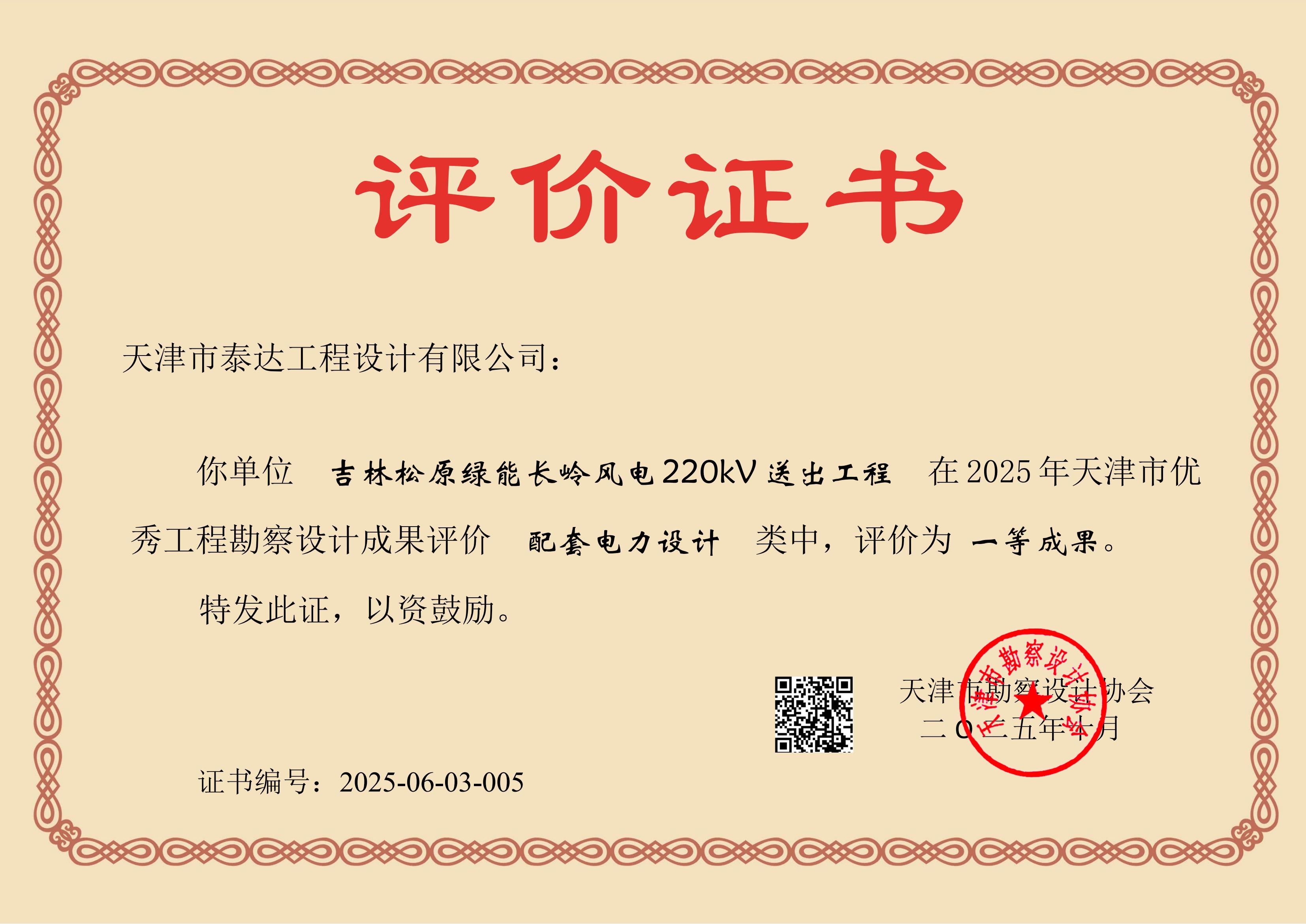 近日,2025年天津市優(yōu)秀工程勘察設(shè)計(jì)成果評價(jià)結(jié)果正式公布,“吉林松原綠能長嶺風(fēng)電220kV送出工程”和“國網(wǎng)天津?yàn)I海公司海洋高新區(qū)3#110千伏變電站電源線工程”分別榮獲配套電力設(shè)計(jì)類一等成果和三等成果,這是泰達(dá)設(shè)計(jì)連續(xù)第11年獲得此類獎(jiǎng)項(xiàng),彰顯了公司在電力勘察設(shè)計(jì)領(lǐng)域的專業(yè)實(shí)力與領(lǐng)先水平。